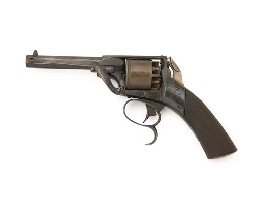 and possibly manufactured by H. Balls of Birmingham circa 1858-59, with blued octagonal 4 1/4in. barrel, dove-tailed blade fore-sight, scroll engraving to the sides of barrel-throat, borderline engraved top-strap with scroll engraving to the front and around the standing notch rear-sight, two-piece blued iron frame with borderline and scroll engraving, the left hand side marked 'H. BALLS PATENT', colour hardened six-shot plain cylinder with milled band to the leading edge, polished spurless hammer with rocking automatic safe below, scroll engraved rocking oval trigger-guard with cocking spur, chequered walnut one-piece grip profiled to the frame with shallow domed and scroll engraved iron butt-cap, the left hand side of barrel mounted with a borderline engraved rammer marked 'PATENT', securing on a screwed stud, expertly re-blued and re-coloured throughout, action slightly at fault