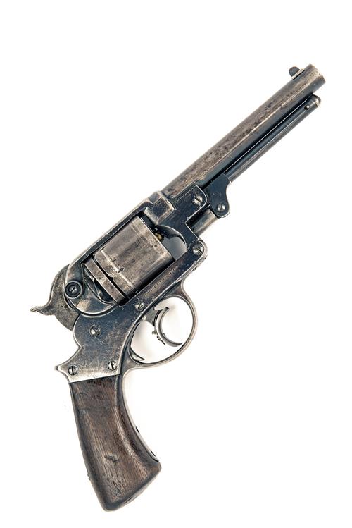 originally percussion, possibly factory converted circa 1870, with round 6in. sighted barrel, dove-tailed blade fore-sight, plain cylinder, plain hinged frame, selectable trigger-blade (mainspring at fault), flared walnut smooth one-piece grip with traces of a martial cartouche and redundant articulated under-barrel rammer, strong amount of original blued finish remaining