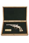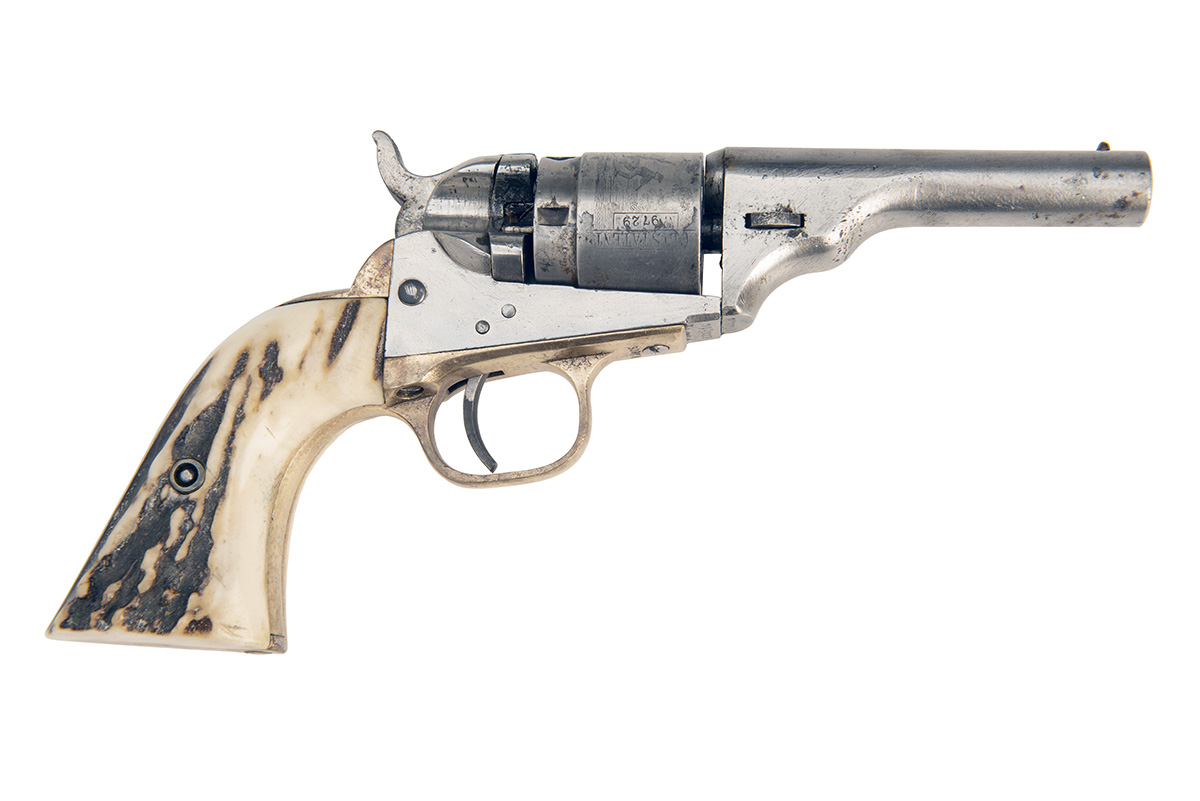 manufactured from existing Colt 1849 Pocket parts with the addition of a new barrel, the top with traces of signature only, stepped cylinder with roll engraved stagecoach hold-up scene, open iron frame with 'PAT JULY 25 1871' and PAT JULY 2 1872' patent dates, no provision for loading gate, brass trigger guard stamped '38 CAL', brass grip-straps fitted with later natural staghorn grips, traces of nickel-plated finish but mostly stripped, together with a later wood case lined in the Continental fashion in green baize, the tray bearing an engraved brass plaque reading 'COLT 1862 POCKET NAVY .38 RIMFIRE CONVERSION 1871-72'