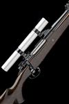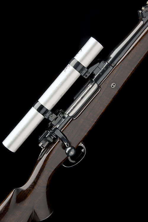 25in. nitro reproved replacement barrel with block-mounted open sights and two folding leaf sights marked 100, 200 and 300, ramp-mounted bead fore-sight, the receiver (with thumb cutout) mounted with telescopic sight rings in quickly-detachable mounts, recoil blocks, hinged floorplate with push button release, figured unchequered pistolgrip stock with steel pistolgrip-cap, sling eyes, 13 5/8in. pull including 3/4in. leather covered recoil pad, weight 9lb. 4oz.