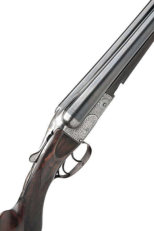 GEO. BATE 12-BORE BOXLOCK EJECTOR, serial no. 3879, 30in. sleeved nitro barrels, 2 3/4in. chambers, bored approx. 1/2 choke in both, treble-grip action, toplever gold-inlaid 'EJECTOR', automatic safety with gold-inlaid 'SAFE' detail, border ad acanthus scroll engraving, 14in. semi-pistolgrip stock including buttplate, weight 6lb. 9oz.