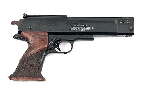 A .177 SINGLE-STROKE PNEUMATIC AIR-PISTOL SIGNED WEIHRAUCH, MODEL 'HW75', serial no. 604315, with 8 1/2in. shrouded barrel, blacked receiver and frame, stippled walnut grip, the whole appearing little used