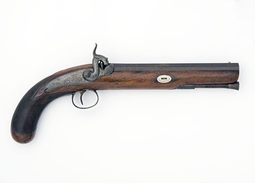 circa 1845, with twist iron 8in. octagonal barrel, bead fore-sight, engraved lines and scrolls at breech, scroll engraved top-tang with standing notch rear-sight, moulded and engraved snail, borderline and scroll engraved back-action lock, dolphin headed hammer, walnut full-stock with chequered bag-shaped butt and brass-tipped under-barrel wood ramrod