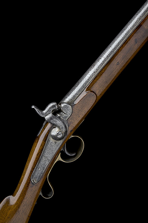 circa 1840, possibly private purchase or a Constabulary contract and similar to a Victoria Carbine (q.v.), with a round 27 1/2in. barrel (exterior cleaned and shallow pitted), applied nickel fore-sight, no provision for rear-sight, solid round-tipped top-tang, borderline engraved back-action lock signed 'FREDC. BARNES TOWER HILL, LONDON', (faint, frosted) walnut full-stock (toe chipped in antiquity) with brass furniture including large patchbox to right hand side of butt, heel-plate with long top-spur, trigger-guard with pistol-gripped tang, single side-nail cup, two ramrod pipes and moulded nose-cap, complete with a disk-ended iron ramrod probably originally captive but with mount removed.