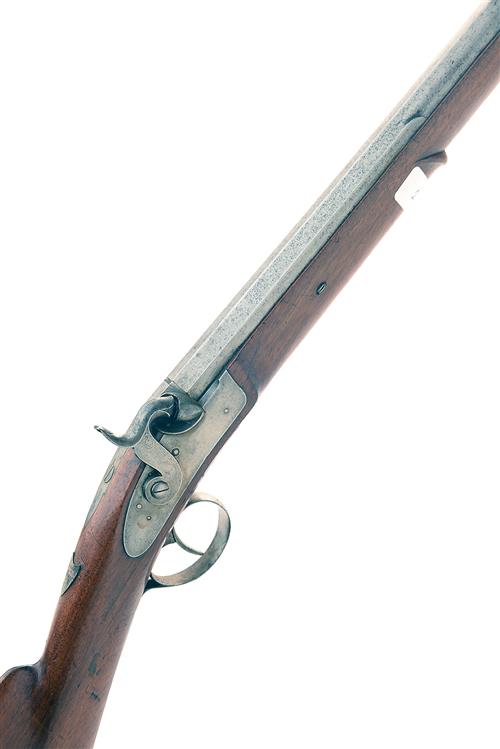 A 14-BORE PERCUSSION SPORTING-MUSKET, UNSIGNED, no visible serial number, Continental, circa 1800 with later conversion to percussion, 28in. barrel with false rifling and flat sighting plane, plain lock, walnut full-stock with white metal shield-shaped escutcheon at wrist with the former owners name, iron furniture and replacement ramrod