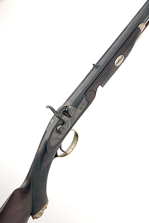 A 28-BORE PERCUSSION PARK-RIFLE SIGNED 'WILLIS, BIRMINGHAM', no visible serial number, circa 1850, with octagonal sighted 28in. barrel, engraved bar-action lock and hammer, chequered walnut pistol-grip half-stock with white metal furniture and signed on a complex escutcheon inlet to the right hand side of butt and replacement ramrod