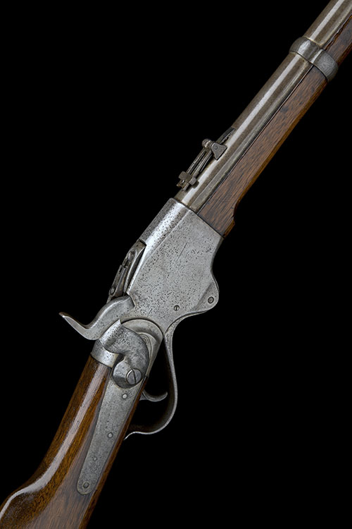 circa 1867, with round 30in. barrel, fore-sight doubling as bayonet lug, folding ladder rear-sight, plain receiver with under-lever opening, the top of receiver stamped 'SPENCER REPEATING RIFLE CO. BOSTON, MASS, PAT'D MARCH 6 1860' (rubbed), Spencer pattern cut-off, back-action sidelock with external hammer, walnut straight-hand butt-stock with magazine tube concealed in the iron heel-plate (magazine at fault), walnut three-quarter fore-end, three iron barrel-bands, the second with provision for swivel, minimal traces of finish throughout