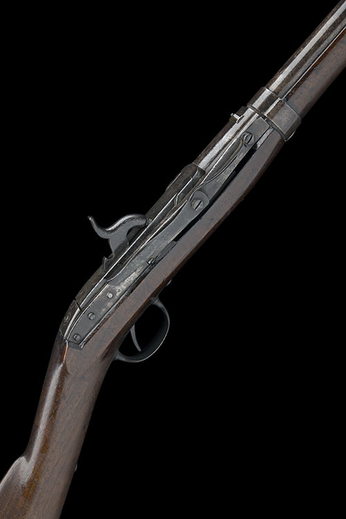 dated for 1845, with round 21in. barrel, small blade fore-sight, standing notch rear-sight, broad iron receiver swelling forwards of centre with a lift-up reverse loading breech operated via a thumb side-lever, offset central hammer, the top of breech-block marked 'U.S., S. NORTH, MIDLTN., CONN 1845', walnut three-quarter stock, iron furniture including two iron barrel-bands (the rear with saddle-ring) and under-barrel ramrod