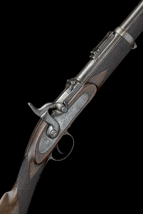 circa 1863, with 25 1/4in. barrel, block and blade fore-sight, elevating ladder rear-sight with additional number '166' below on the left and 'CSA' below on the right, London proofs at breech, flip up chamber for combustible cartridge, the top-tang marked 'MONT STORM'S PATENT No.1125' (faint), borderline engraved military style lock with traces of a 'T. MURCOTT, LONDON?' address, chequered walnut half-stock, iron furniture and no provision for clearing rod, exposed iron surfaces shallow pitted, woodwork with expert period inlet repairs