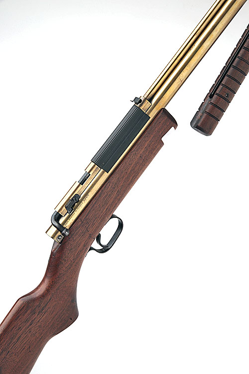 A .22 MULTI-PUMP PNEUMATIC AIR-RIFLE SIGNED BENJAMIN, MODEL '312', serial no. H347789, with polished brass 19in. barrel, bolt action receiver, polished brass pump-housing and walnut butt-stock with walnut 'corn-cob' fore-end