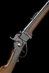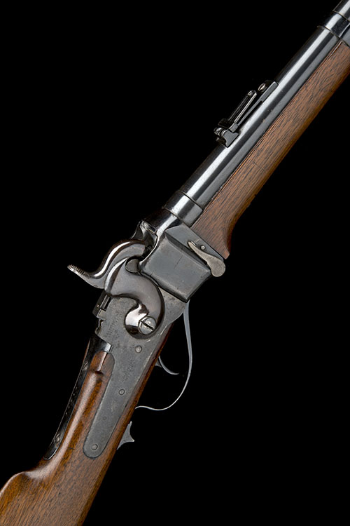 circa 1864, with re-blued 22in. barrel, block and blade fore-sight, folding ladder rear-sight, faint traces of model details at breech, vertical dropping block receiver, the lockplate with in-built pellet primer and marked 'R.S. LAWRENCE PAT. APRIL 12TH 1859', the body of the lock marked 'C. SHARPS PAT. OCT. 5TH 1852', straight hand walnut butt-stock, no provision for patchbox, iron heel-plate, under-lever opening, saddle-ring mounted to left hand side of the receiver, walnut splinter fore-end and single iron barrel-band, refinished throughout