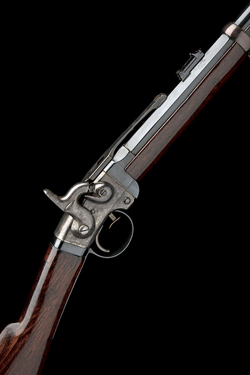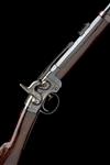circa 1863, with blued 21 1/2in. round barrel hinged at the breech, blade fore-sight, small folding ladder rear-sight with sliding notch, colour hardened boxlock action with external hammer and barrel-latch released by auxiliary trigger within the trigger-guard, straight-hand walnut butt-stock (cracked lengthways at wrist), iron furniture, plain walnut fore-end with single barrel-band, the whole refinished and recoloured