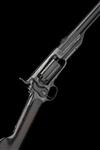 circa 1860, with round 18in. barrel, octagonal breech section, dove-tailed fore-sight, rear-sight with twin folding leaves, flat bevel-edged top-strap (cracked and repaired in antiquity), fully fluted cylinder, exposed side-hammer, saddle-ring to left hand side of frame, walnut butt-stock with semi-crescent and numbered heel-plate, long lower tang (swivel removed), guarded trigger and under-barrel loading-lever, the whole darkly stained