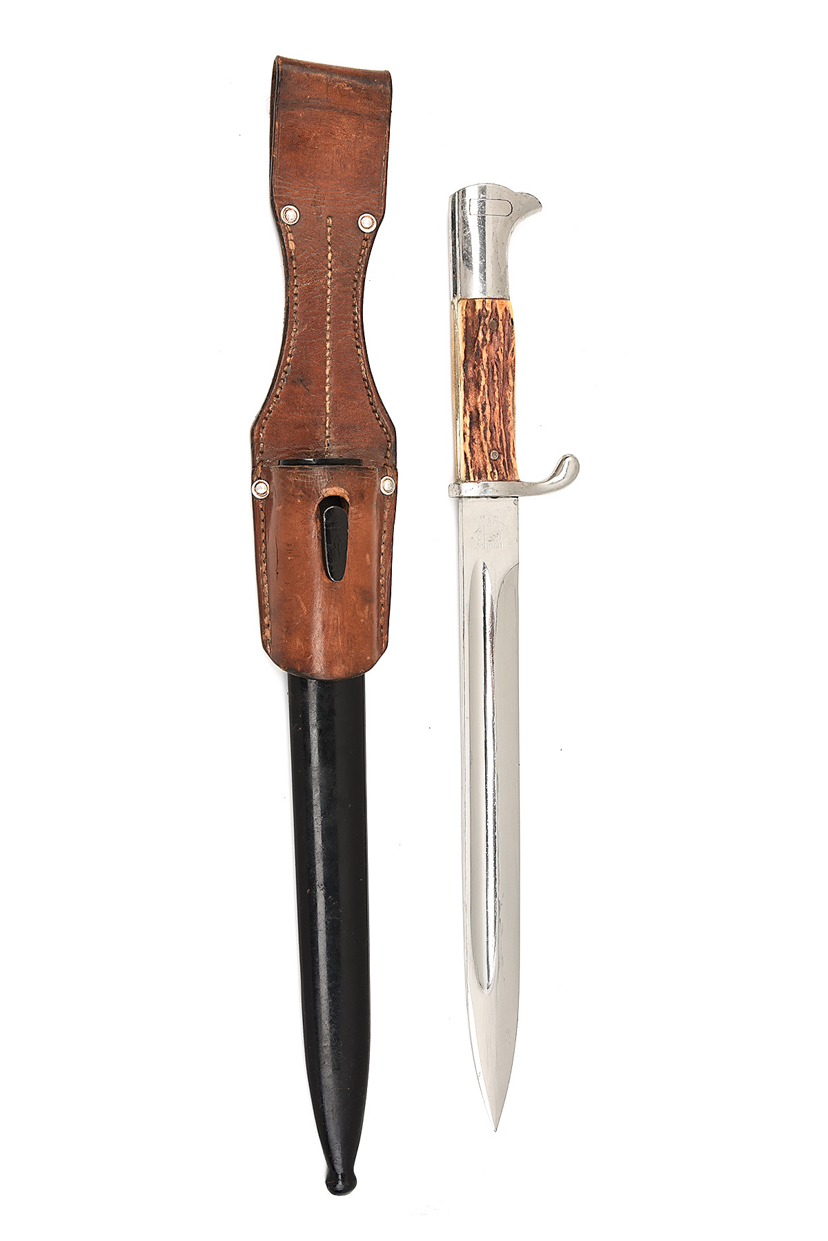 A GERMAN K98 MAUSER DRESS BAYONET SPURIOUSLY MARKED FOR THE REICHSBUND DEUTSCHE JÄGERSCHAFT [GERMAN HUNTING UNION], circa late 1930s, with single-edged 10 in. chromed steel blade fullered on each side, ricasso marked 'ORIGINAL / EICKHORN / SOLINGEN', chromed steel cross-guard and hilt. stag-horn grips with the swastika and stag's horns badge of the RDJ glued to one side, black steel scabbard, brown leather frog, post-war fantasy creation, 16 1/2 in. overall