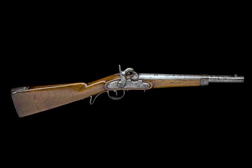A .750 PERCUSSION CAVALRY-CARBINE SIGNED WANZEL, MODEL LORENZ RIFLED CARBINE, no visible serial number,
