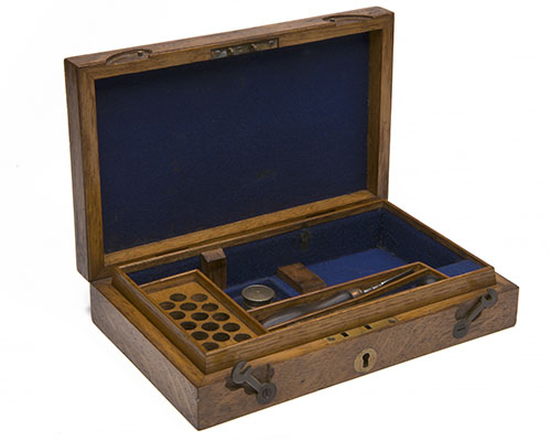 approximately 10in. x 6 1/4in. x 2in., with key and hook closure, the interior compartmented and lined in blue baize and containing a turn-screw, cleaning rod and oil-bottle, little used condition