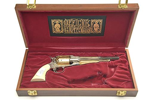 A REPRODUCTION .44 PERCUSSION CASED LIMITED EDITION PISTOL, SIGNED ASM, MODEL 'THE OFFICER', serial no. A18499 with an 8in. octagonal sighted nickel plated floral engraved barrel, a gold washed nickel plated floral engraved cylinder, floral engraving to the nickel plated closed frame and ivorine smooth grips, named 'The Officer and the Gentleman' this cased pistol if part of a presentation pair, where the .36 pocket pistol is missing from the ruched velvet fitted case.