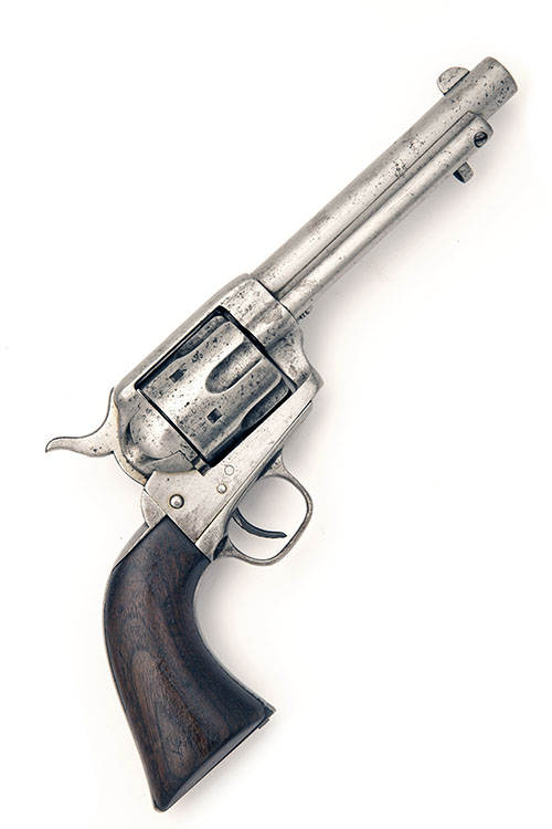 second year of manufacture, 1874, with brushed bright 5 1/2in. barrel scrubbed of address details, 'bullseye' ejector, front of frame retaining screw for cylinder arbor, solid iron frame with two lines of patents to 1872, matching number cylinder, iron grip-straps and smooth walnut grips (worn), the whole heavily cleaned of all finish, some mild pitting and detail faint where present.