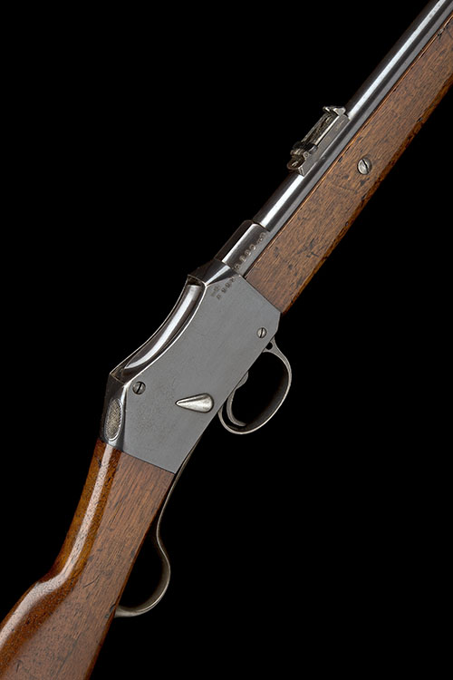 circa 1880, possibly commercial, with blued 21 1/2in. barrel, fore-sight blade with side protectors, elevating ladder rear-sight, plain blued receiver with no details, walnut butt-stock, iron furniture, walnut three-quarter fore-end with moulded iron nose-cap, no provision for bayonet and iron under-barrel clearing rod, much, apparently original, finish