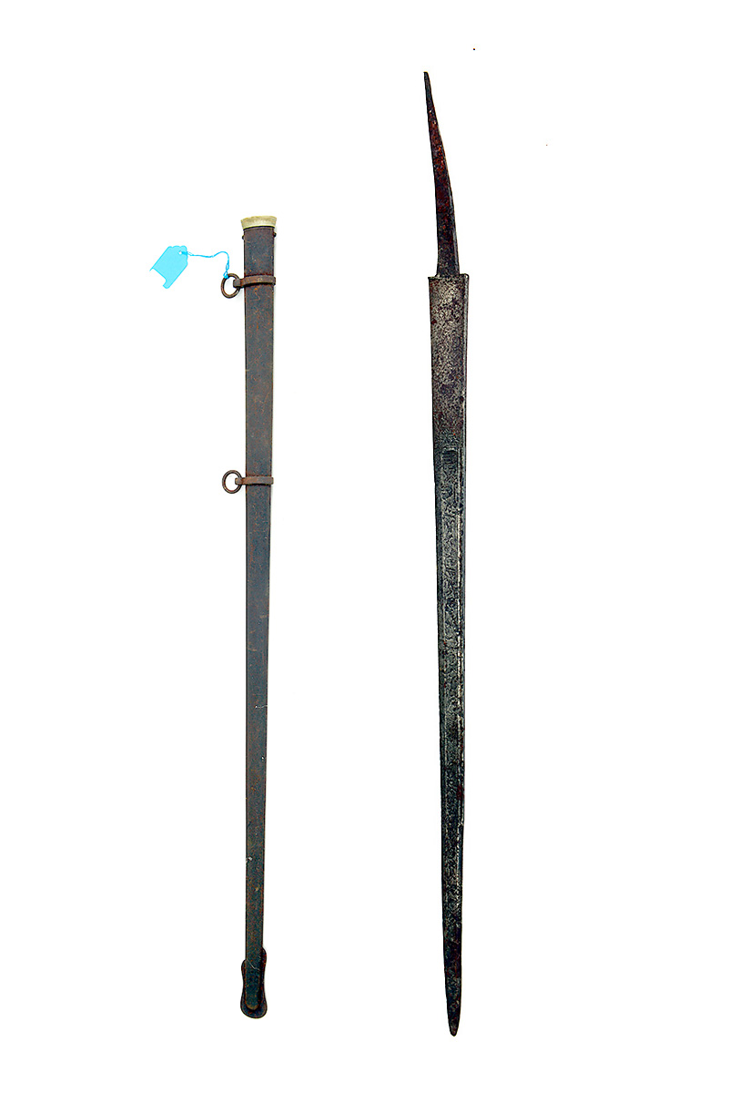 A SWORD SCABBARD AND AN ENGRAVED BLADE FROM A HUNTING HANGER, the first metal, straight with rusted finish, the second probably French, 24 3/4in. overall (2)