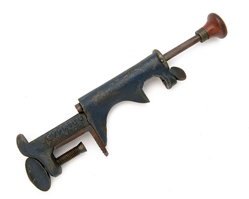 THE WAD PLUNGER ASSEMBLY FROM A JEFFERIES OF NORWICH PATENT LOADING TOOL, patent dated for 1900, with table clamp and further clamp to accept the roll turn-over tool (midding), body cracked but functional