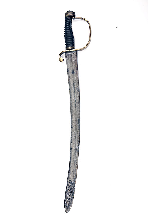 A CUT-DOWN BRASS-HILTED SABRE, possibly Continental and re-formed into a hanger, with broad fullered curving 22in. blade, 'D' shaped knuckle-bow with ribbed fishskin grip, small losses, no scabbard