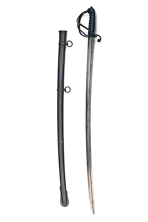 A BRITISH 1821 PATTERN LIGHT CAVALRY OFFICER'S SWORD, with quill-tipped 35 1/4in. pipe-backed blade (traces of etched detail, iron three-bar hilt, wire-bound fishskin grip and complete with its iron scabbard