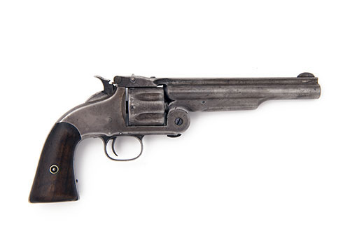 circa 1873-74, with 6 1/2in. barrel, raised sighting rib scrubbed of details, fluted cylinder, break-open frame, smooth walnut grips, the whole stripped of finish and worn