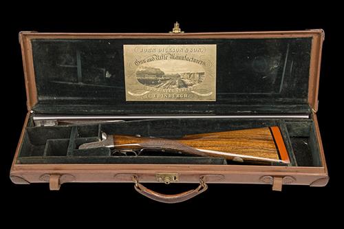 26in. nitro reproved barrels, rib with later engraved 'DICKSON & SON', 2 3/4in. chambers, bored approx. true cyl. and full choke, automatic safety, acanthus scroll engraving with scrolling banners engraved 'DICKSON & SON', brushed and reblued finish overall, 14 1/2in. stock including 7/8in. rubber recoil pad, weight 6lb. 1oz., in a lightweight leather case with dark green velveteen lining