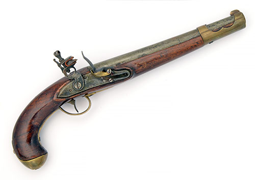 circa 1815, with 10 1/4in. tapering iron barrel, foresight integral with the twin-band brass nose-cap, no provision for rear-sight, solid top-tang, flat bevel-edged lock with brass pan, walnut full-stock with bag-shaped butt (cracked and repaired at wrist) brass furniture and no provision for ramrod
