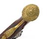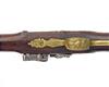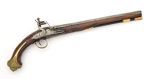 possibly Dutch, circa 1760, with heavily cleaned iron 13 3/8in. barrel, traces of carved rib, engraving and a rubbed out brass makers poincon, solid squared top-tang, carved and engraved bevel-edged lock with radiused and pointed tail, carved hammer, grooved frizzen, walnut full-stock (small losses, cracks and some re-modelling), cast brass furniture with relief carved marshal trophies and probable replacement ebony ramrod with brass tip