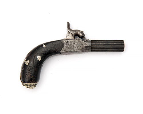 BURNETT, SOUTHAMPTON 54-BORE PERCUSSION WHITE-METAL MOUNTED BOXLOCK POCKET-PISTOL, no visible serial number, circa 1830, with blued fully fluted 2in. turn-off barrel (frozen), false rifling at muzzle, Birmingham proofs, squared boxlock action with border and scroll engraving, central hammer, the top-tang signed 'BURNETT, SOUTHAMPTON', automatic concealed trigger, ebonised butt with silver wire and floral silver inlays (losses) and cast white metal lionshead butt-cap