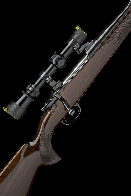 20 1/2in. nitro barrel with block-mounted open sights, ramp-mounted blade fore-sight, the receiver mounted with a Leupold Vari-X III 1.5-5 telescopic sight, serial no. 178118G, in quickly-detachable mounts, hinged straddle floorplate with push button release, set triggers, pistolgrip stock with cheekpiece, monte carlo comb, sling eyes, birdshead pistolgrip-cap, 14 3/4in. pull including 3/4in. rubber recoil pad, weight 7lb. 15oz. (unscoped) and 8lb. 14oz. (with scope)