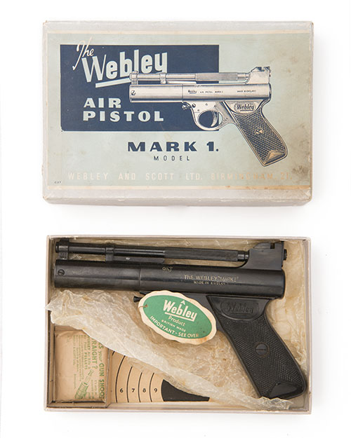 circa 1956, with 6 1/2in. barrel, pull-back locking-catch, blued stepped air-chamber marked 'THE WEBLEY MARK I' and 'MADE IN ENGLAND' on the left hand side and 'WEBLEY & SCOTT LTD BIRMINGHAM' along with 'WEBLEY PATENTS' on the right, chequered bakelite grips, complete with its pale blue card carton, instructions inside the lid, original target, swing ticket and sample pellet envelope, the whole appearing unused