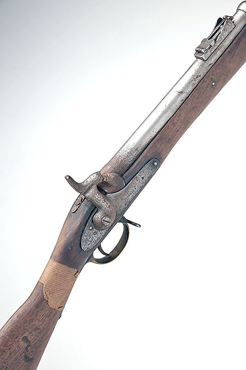 A .577 PERCUSSION SINGLE-SHOT SERVICE RIFLE SIGNED TOWER, MODEL 'PATTERN '56 SHORT RIFLE', no visible serial number, dated for 1856, with 33in. sighted barrel, plain lock with maker, date and 'VR' crown device (all faint), walnut three-quarter stock, brass furniture, two iron barrel-bands and jag-ended ramrod, worn throughout