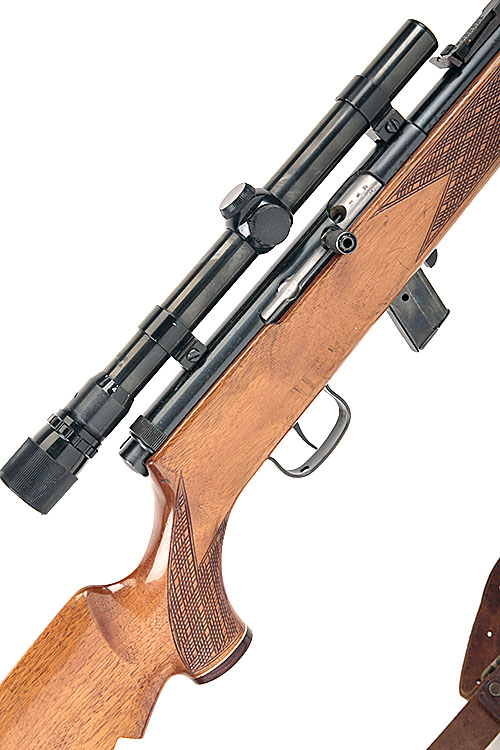 VOERE .22 L.R. SELF-LOADING SPORTING RIFLE, serial no. 188150, 21 1/4in. nitro barrel, fore-sight missing, tangent rear sight, fitted with a Weaver V22-A telescopic sight, manual safety, detachable magazine, 13 1/2in. pistolgrip stock with cheekpiece, leather sling