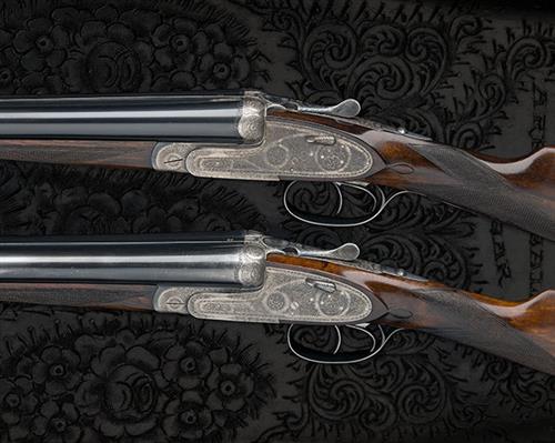 26 3/4in. nitro chopperlump barrels, raised file cut ribs gold-inlaid '1' and '2' at the breech ends, tubes engraved 'PEDRO ARRIZABALAGA. EIBAR. ACERO CROMO NIQUEL', 2 3/4in. chambers, bored approx. true cyl. and 1/4 choke (No.1) and 1/4 and 1/2 choke (No.2), No.2 left wall thickness at 19, treble-grip actions with hidden third bites and side-clips, removable striker discs, toplevers gold-inlaid '1' and '2', automatic safeties, Holland & Holland style self-opening systems, hand-detachable lockplates, cocking-indicators, articulated front triggers (set for the left hand), floral and acanthus scroll engraving, retaining very slight traces of original colour-hardening, 14 3/4in. figured stocks (cast on for the left shoulder) including 3/4in. rubber recoil pads, small knot split No.1, slight setting cracks to rear of top tangs, weight 6lb. 6oz. (No.1) and 6lb. 2oz. (No.2)