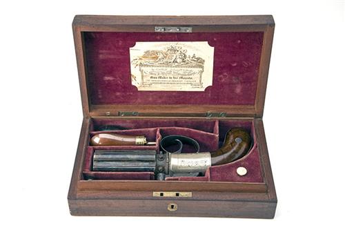 circa 1845, with colour hardened solid 3 1/2in. six-shot barrel group with London proofs and moulded false side-ribs, engraved axle screw, border and scroll engraved rounded nickel-silver action body with bar-hammer to the top and coin milled leading edge, the action sides signed 'J. BLANCH GRACE CHURCH ST. LONDON' on the left and 'IMPROVED REVOLVING PISTOL' on the right, scroll engraved nickel-silver grip-straps, smooth walnut bag-shaped grips, blued and engraved trigger-guard bow, the whole with light surface storage corrosion but with virtually all its colour and finish and appearing little used in it makers mahogany storage case, compartmented and lined in rose velvet and containing a near mint condition Sykes bag shaped powder flask of the smallest size, a nipple key and loading rod, Blanch parchment label to inside of lid.