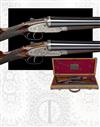 28in. nitro barrels, No.1 unsigned replacements (circa 1973), No.2 rib engraved 'HENRY ATKIN (FROM PURDEY'S). 41 JERMYN ST. LONDON. S.W.', (faint), gold-inlaid '1' and '2' at the breech ends, 2 1/2in. chambers, bored approx. 3/4 and full choke (No.1), true cyl. and 1/2 choke (No.2), self-opening actions with removable striker discs, toplevers gold-inlaid '1' and '2', automatic safeties with gold-inlaid 'SAFE' details, best fine floral bouquet and acanthus scroll engraving, the undersides engraved 'HENRY ATKIN FROM PURDEY'S', brushed and blued finish, 14 5/8in. figured stocks (No.2 a replacement), weight 6lb. 15oz. (No.1) and 6lb. 10oz. (No.2), in their brass-cornered oak and leather case with serial numbered bone striker pots