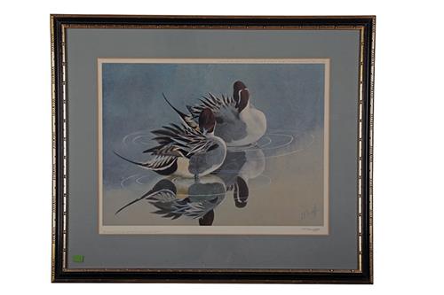 A COLLECTION OF FOUR LIMITED EDITION G.F. TUNNICLIFFE PRINTS, non match edition numbers, showing prints of mallard ducks, pintail ducks and sea birds, glazed and set in a gilt from, measuring approx. 29in. x 26in.