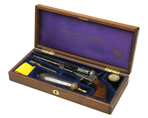for 1971, with 7 1/2in. blued barrel engraved with the Colt address along the top and 'ULYSSES S. GRANT COMMEMORATIVE - NINETEEN SEVENTY ONE' along the left hand side, blued cylinder roll-engraved with naval engagement scene, case-hardened frame, silver-plated grip-strap and trigger-guard, walnut grips, complete with its manufacturers original lined and fitted case with powder-flask, bullet mould & cap tin and appearing to be virtually unfired