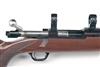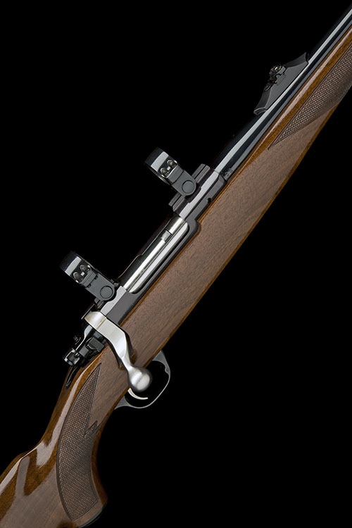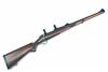 18 3/8in. nitro barrel, ramp-mounted folding rear sights, ramp-mounted bead fore-sight, receiver mounted with telescopic sight rings, hinged floorplate with push button release, full length pistolgrip stock with pistolgrip-cap, sling eyes, 13 3/4in. pull including 5/8in. rubber recoil pad, weight 7lb.