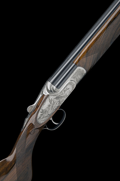 29in. nitro barrels with raised tapered solid matt top-rib, 2 3/4in. chambers, bored approx. imp. cyl. and 1/4 choke, hold-open toplever, automatic safety with integral triggerplate release, fine acanthus scroll engraving surrounding game scenes of pheasant and woodcock in flight, the triggerplate signed 'D. BONSI', bright finish overall, 15 1/4in. highly-figured semi-pistolgrip stock including 7/8in. rubber recoil pad, weight 7lb. 1oz., in its universal case