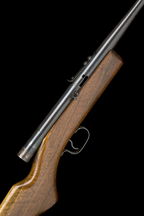 believed for May 1968, with grey phosphated 17in. tapering round barrel, blade fore-sight, loading aperture forwards of the buckhorn rear-sight, housing for an 8gm. CO2 cylinder to rear, cocking handle to right hand side and walnut half-stock