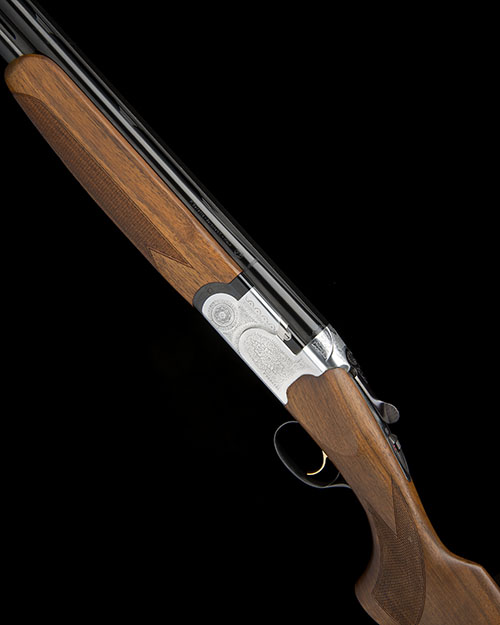 29 1/2in. nitro barrels with 11mm ventilated matt top-rib and high visibility fore-sight, 2 3/4in. chambers, bored approx. imp. cyl. and 3/4 choke, hold-open toplever, manual safety with integral barrel selector switch, gold-washed trigger, floral and scroll engraving, bright finish, 14 5/8in. pistolgrip stock including 1in. rubber recoil pad, weight 7lb. 10oz.