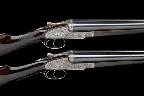 28in. nitro reproved barrels, ribs gold-inlaid '1' and '2' at the breech ends, No.1 with 'Royal Brevis', tubes engraved 'HOLLAND & HOLLAND. 98. NEW BOND STREET. LONDON.', 2 1/2in. chambers, bored approx. 1/4 choke in both (No.1) and 1/4 and 1/2 choke (No.2), wall thicknesses well below recommended minimum, toplevers gold-inlaid '1' and '2', automatic safeties with gold-inlaid 'SAFE' details, gold-inlaid cocking-indicators, rolled-edge triggerguards, best bold Royal scroll engraving, the undersides with elaborate cartouches engraved 'ROYAL SELF-OPENER PATENT 1922', brushed finish overall, 14 3/4in. figured stocks (chequering worn) including 5/8in. rubber recoil pads, No.1 including 3/4in. wooden extension and with light damage to right edge of fore-end wood, weight 5lb. 15oz.