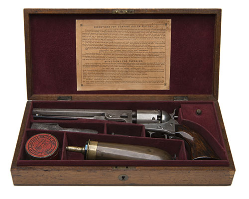 for 1855, with octagonal 7 1/2in. barrel signed 'ADDRESS COL. COLT LONDON', plain cylinder with roll engraved naval scene, plain iron open frame signed 'COLT'S PATENT', smooth walnut one-piece grip, iron grip-straps and trigger-guard, articulated under-barrel rammer, traces of finish, complete with its original storage case, replacement parchment instruction label to inside of lid, compartmented and lined in red baize and containing a number of associated accessories including wood handled cleaning rod, iron double-cavity bullet mould, replacement 'L' shaped nipple-key, oil bottle, powder flask and a cap tin