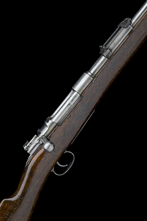 29in. nitro reproved barrel with tangent rearsights and post fore-sight, receiver engraved 'DEUTSCHE WAFFEN - UND MUNITIONSFABRIKEN. BERLIN' on the sidewall, bolt numbered 721, floorplate with military style release, the stock (hand-guard cut down) carved on the right side of the butt 'J.J. de Beer' with a garland surrounding a heart and 'De Heer is Mijn rots in den Stijd.', sling swivels, 13 1/4in. pull including steel buttplate, weight 9lb. 5oz. .
