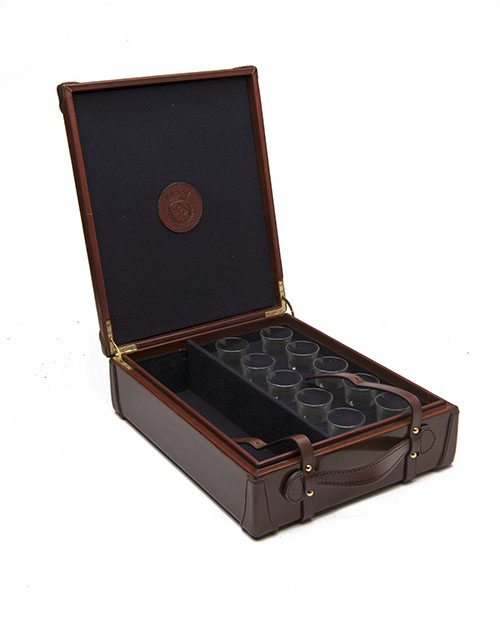 A LEATHER CASED WISKERA WITH TEN SHOT GLASSES,