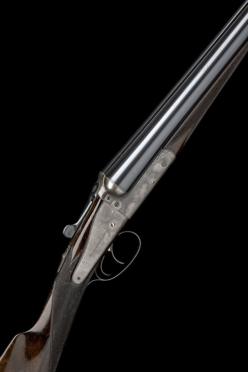 28in. nitro barrels, tubes engraved 'HOLLAND & HOLLAND. 98. NEW BOND STREET. LONDON.', 2 1/2in. chambers, bored approx. imp. cyl. and 1/4 choke, action with patent gas checks, automatic safety with gold-inlaid 'SAFE' detail, gold-inlaid cocking-indicators, border engraving, retaining traces of original colour-hardening, 14 3/4in. stock, slightly swept at comb, including 1in. wooden extension, fore-end with Deeley & Edge patent release, weight 6lb. 9oz.